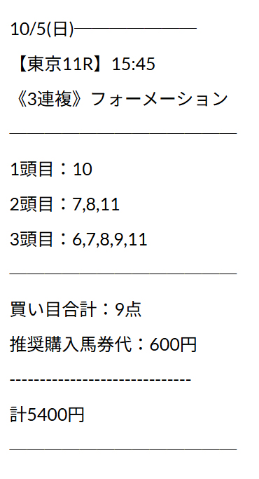 10月最初の重賞無料予想毎日王冠で買い目点数9点の三連複的中ゲット~